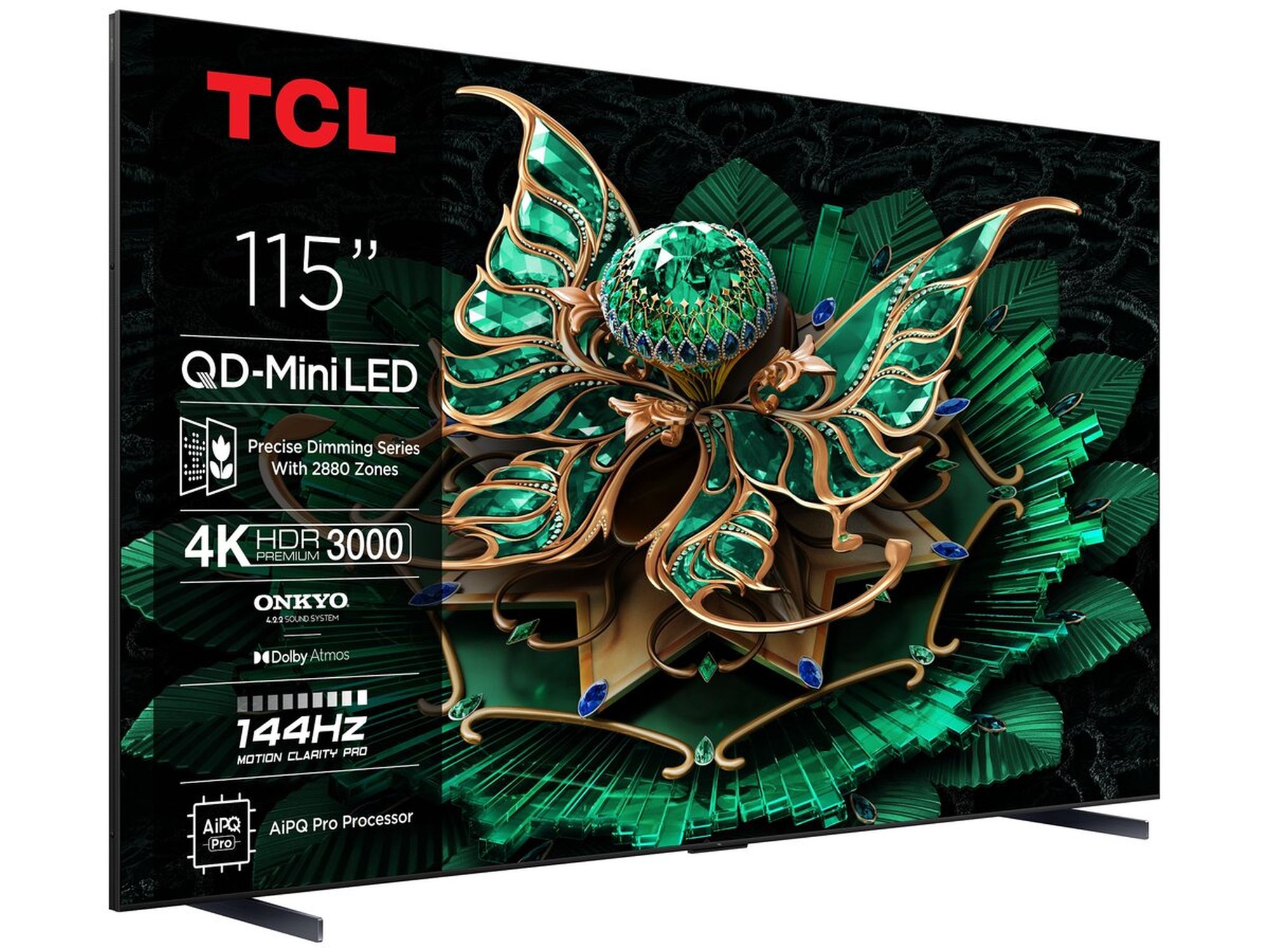 Telewizor TCL 115C7K: imponujący, 115-calowy ekran QD-Mini LED. Łączy technologie Mini LED i Quantum Dot, oferując niezwykłą jasność i kolory. Wyposażony w system dźwiękowy Onkyo 4.2.2 z Dolby Atmos oraz Google TV, ma być centrum domowej rozrywki.
