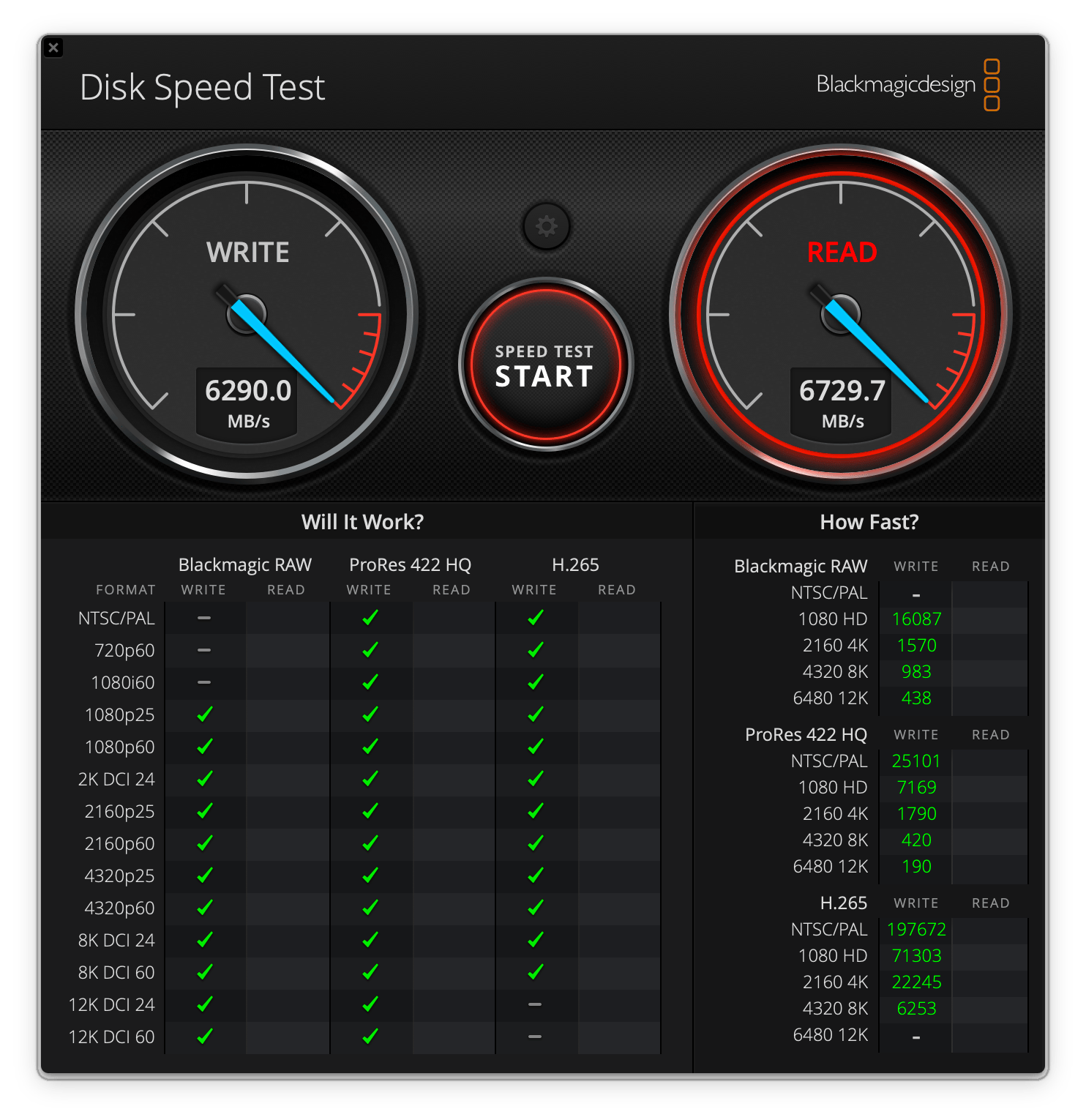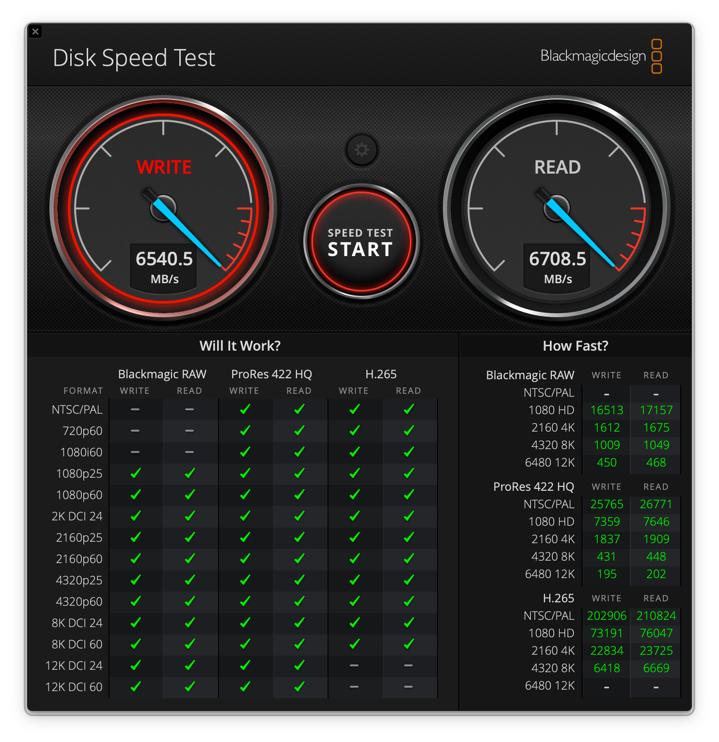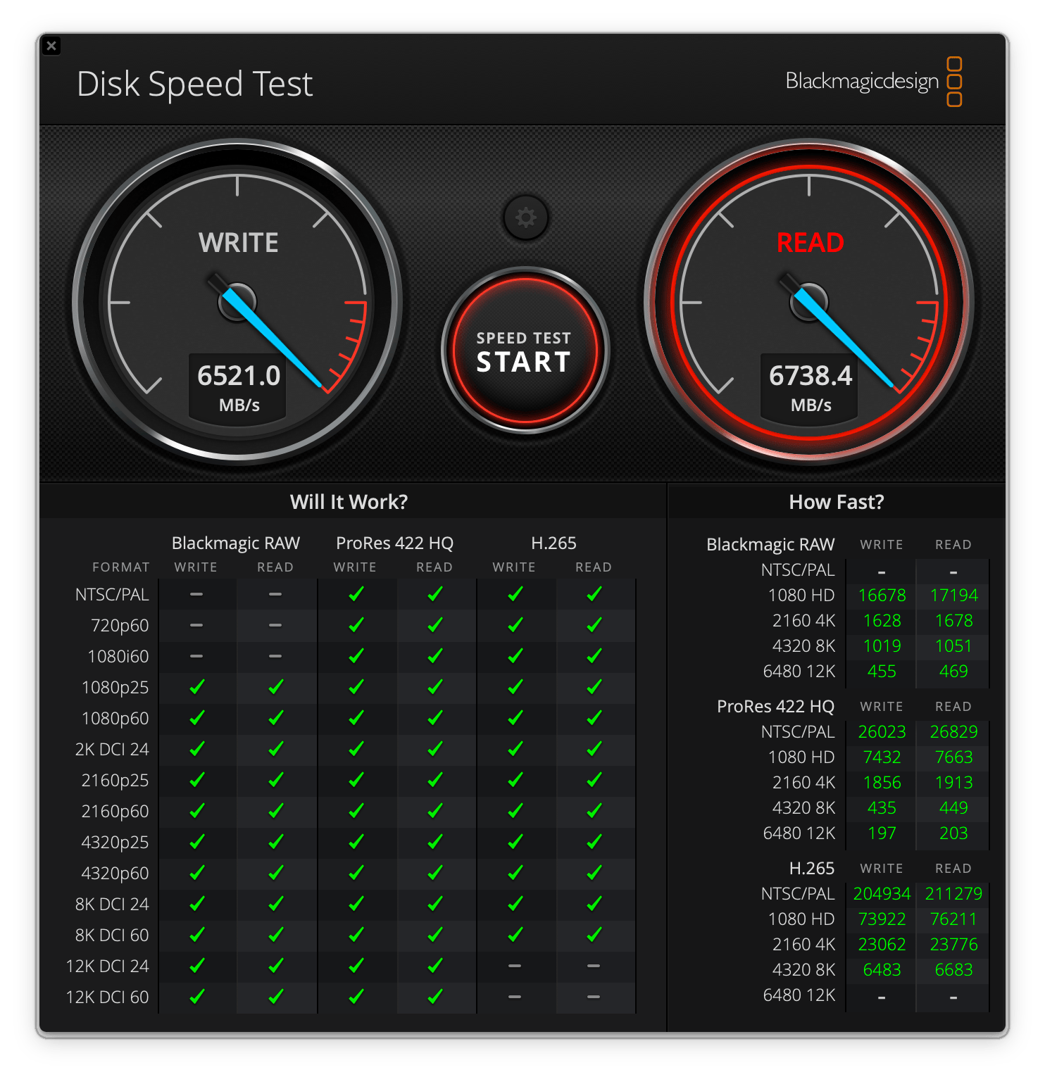 Blackmagic Disk Speed Test | Odczyt w MB/s | Zapis w MB/s |