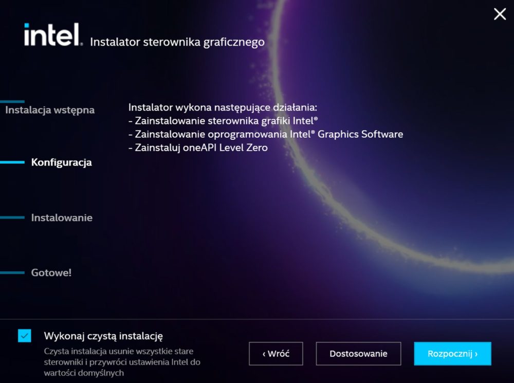 - Kluczowy moment – czysta instalacja; uruchom instalator pobranej paczki ze sterownikami graficznymi. W jednym z pierwszych kroków zobaczysz małe pole do zaznaczenia: „Wykonaj czystą instalację”.