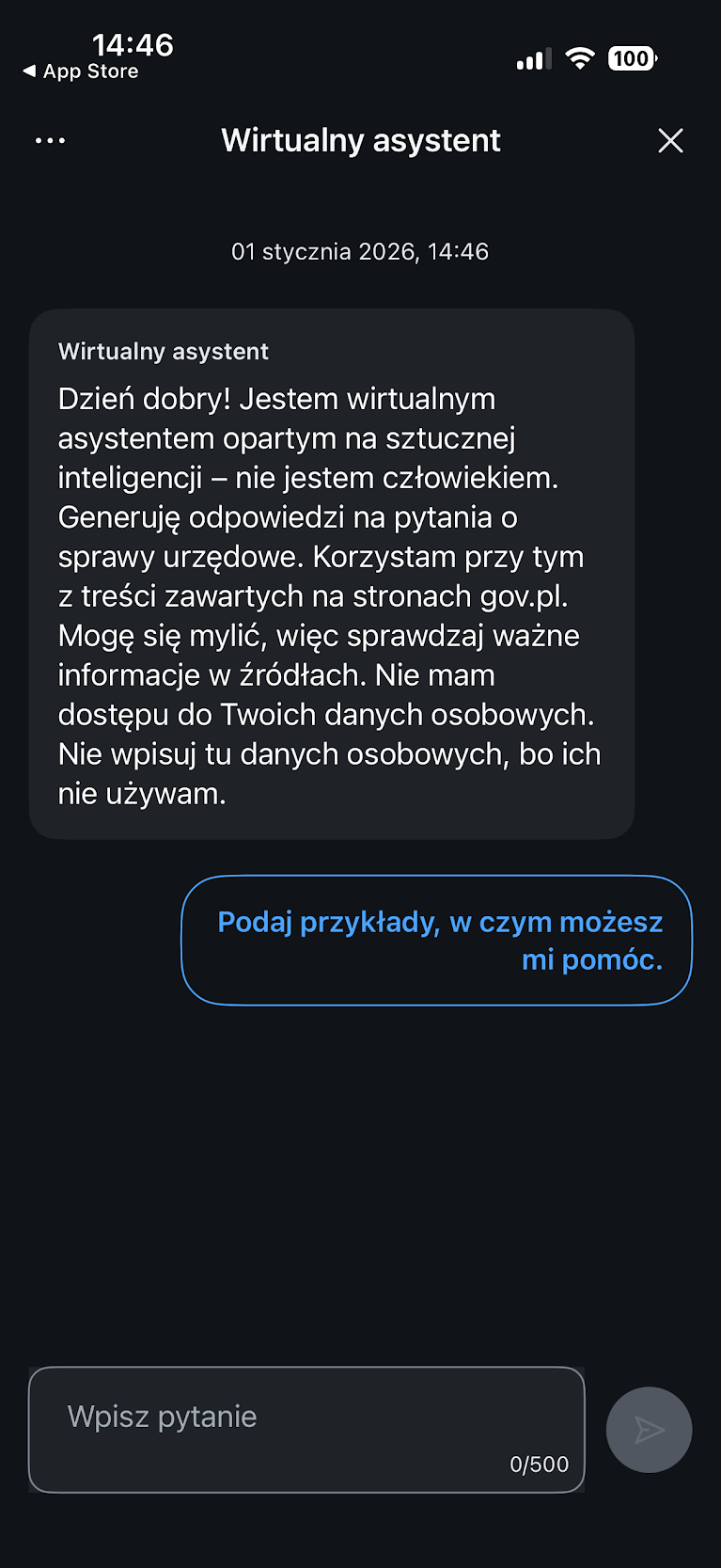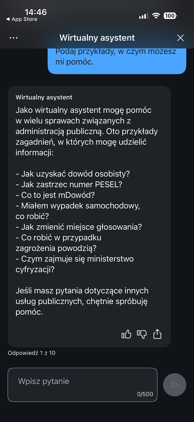 Asystent w mObywatelu to narzędzie zadaniowe, a nie towarzyskie. Ma sztywne ramy bezpieczeństwa. Pomoże: znaleźć wniosek, wytłumaczyć procedurę urzędową, wskazać, gdzie w aplikacji są Twoje punkty karne czy inne obecnej w niej funkcje i informacje.