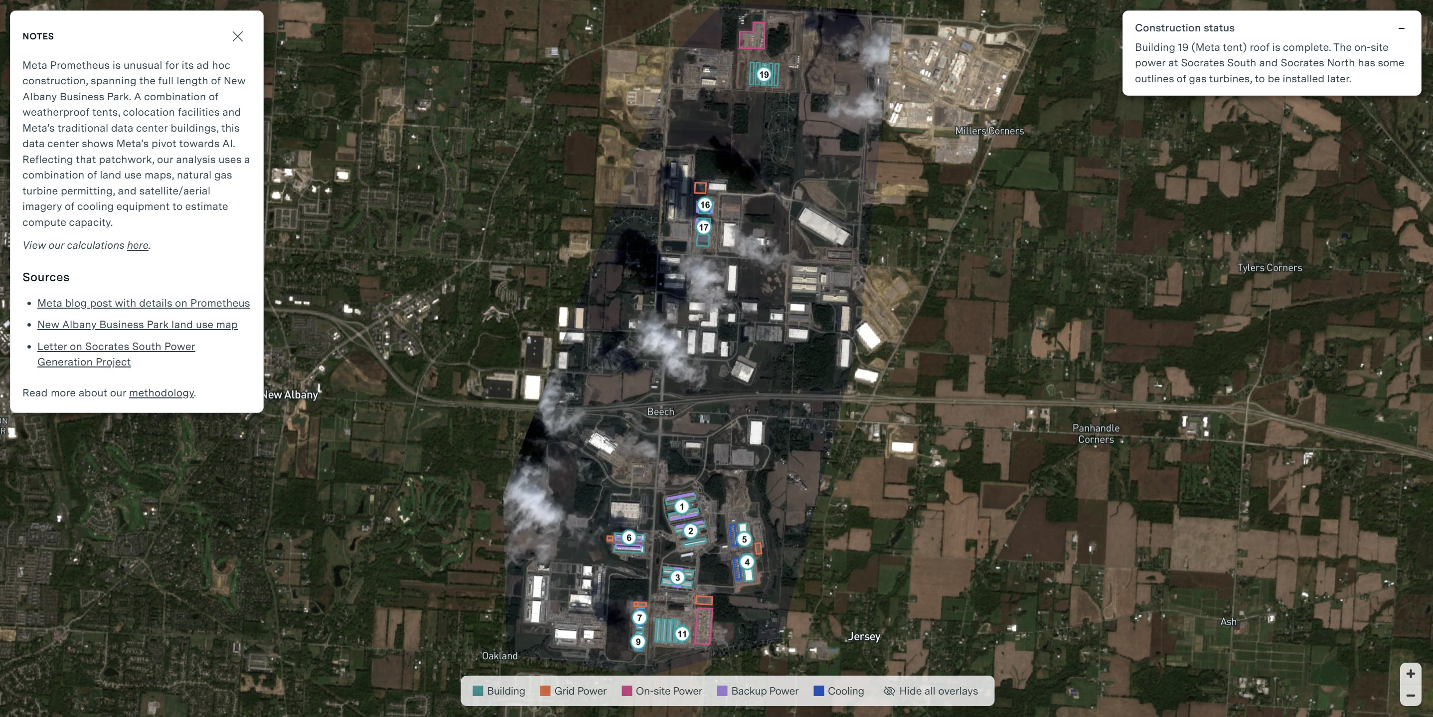 Meta w Ohio: projekt „Prometheus” w New Albany to nie zwykła serwerownia. To kompleks o szacunkowym koszcie 18 miliardów dolarów, który zużywa 691 MW mocy (są to szacunki oparte na modelu chłodzenia, a nie oficjalne dane operatorów). Satelity pokazują tam mieszankę tradycyjnych budynków i tymczasowych namiotów – dowód na to, jak bardzo Meta spieszy się z wdrożeniem AI.