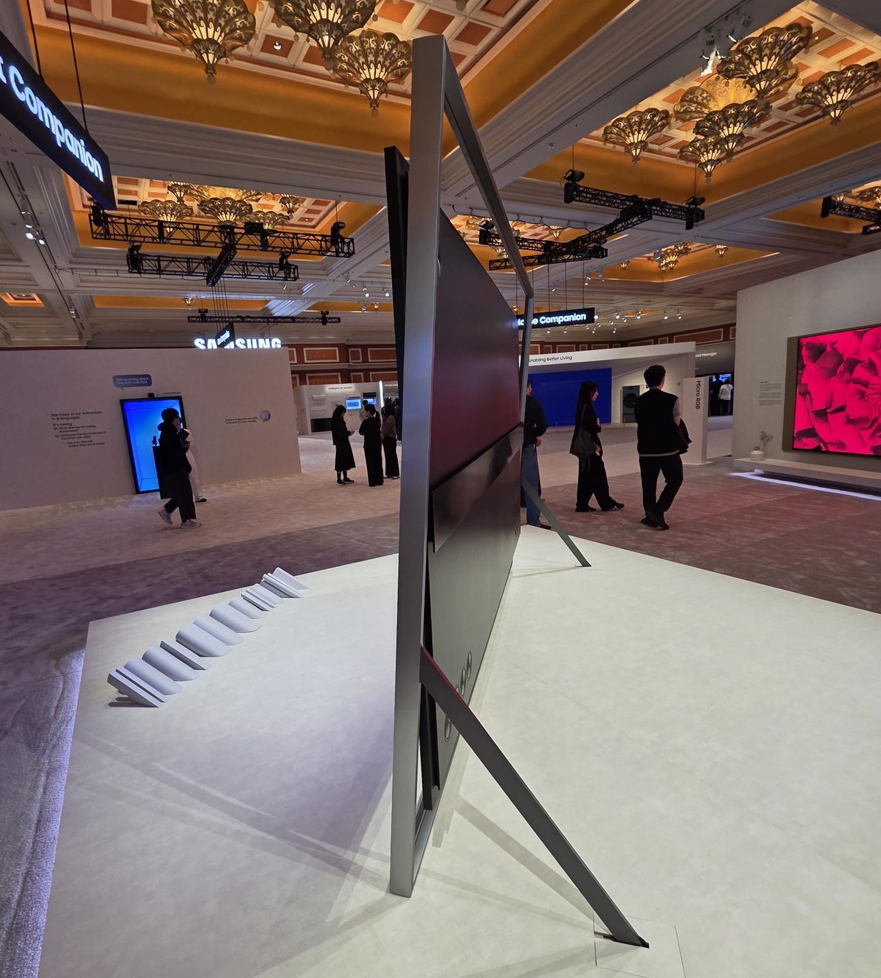 Zapomnijcie o wieszaniu tego giganta na ścianie w klasyczny sposób. Model R95H korzysta z nowej koncepcji wzorniczej „Timeless Frame”. Patrząc na zdjęcia z hal w Las Vegas, widzimy konstrukcję przypominającą potężną, industrialną sztalugę, w której ekran zdaje się swobodnie lewitować.