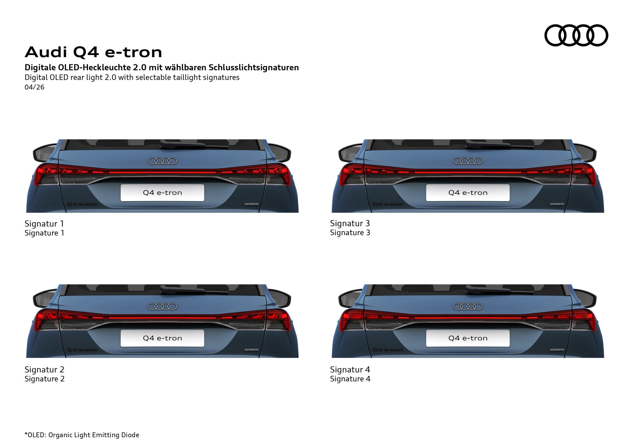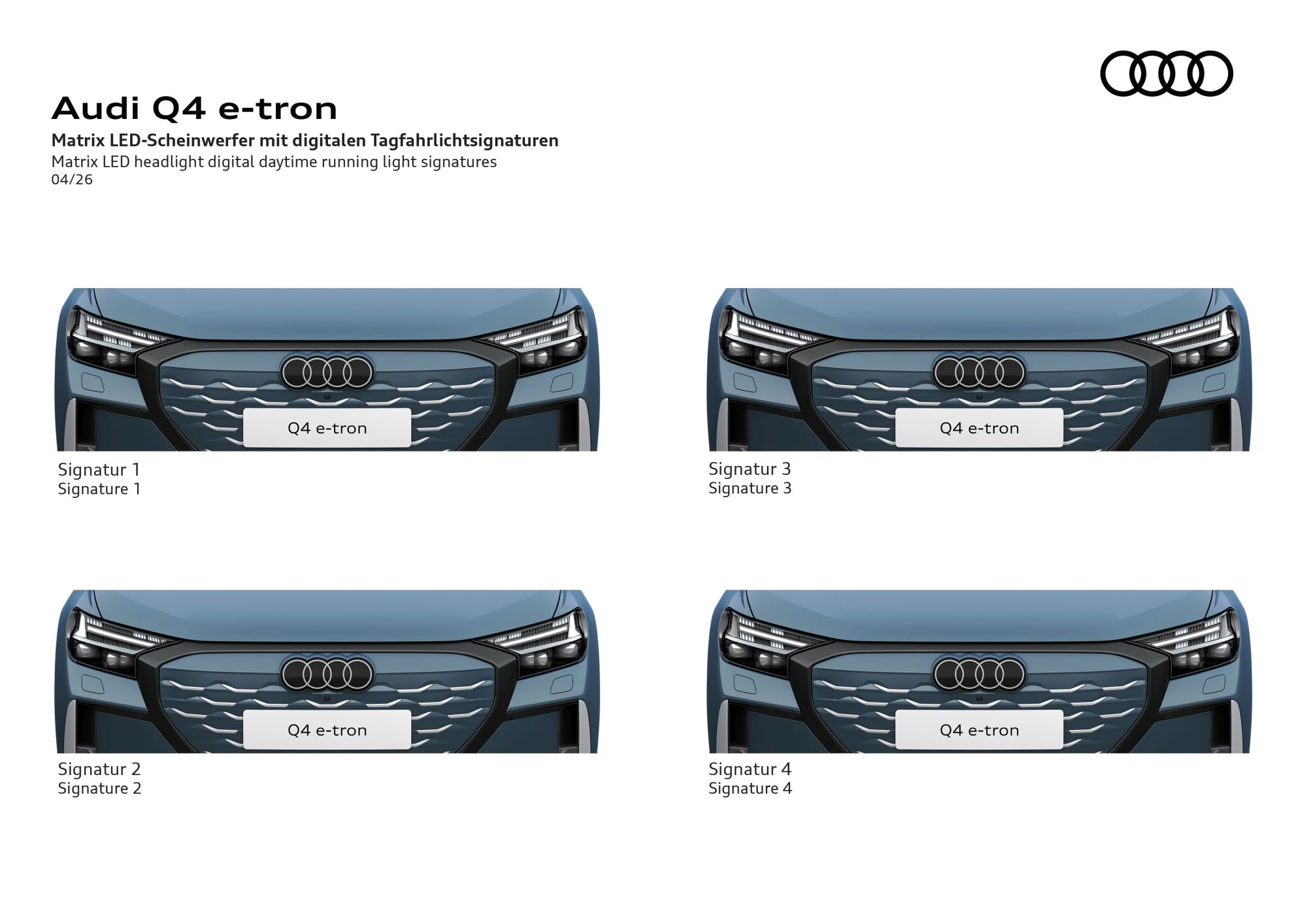 Zamówienia na zmodernizowane Audi Q4 e-tron będzie można składać w Europie od maja, a pierwsze egzemplarze trafią do klientów latem 2026 roku. W Niemczech cennik otwiera kwota 47 500 euro za wersję z bazowym akumulatorem 63 kWh. Poniżej galeria zdjęć i technicznych infografik dotyczących nowego Audi Q4 e-tron.
